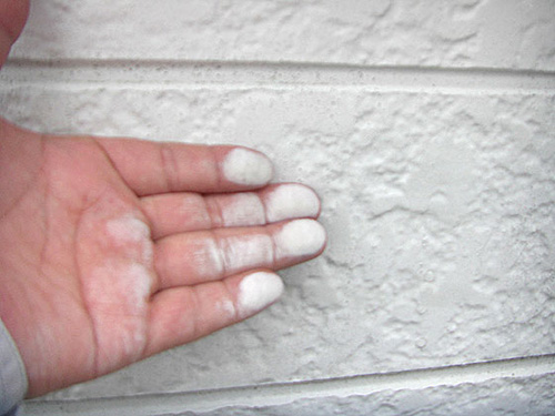外壁塗装のサインとして最も有名なのが、外壁を触ると白い粉が手につくチョーキング現象です。これは塗料の顔料が粉状になって表面に付着する現象であり、塗膜の保護機能が失われているサインです。ただ、「自分の家は触っても粉がつかないから、まだ大丈夫だろう」と思っていらっしゃる方も多いかもしれません。