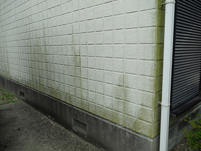 外壁が緑色のコケや黒色のカビ・藻で汚れていないか確認してください。特に日当たりが悪く湿気がたまりやすい北面に多く見られ、塗料の防カビ・防藻機能が失われている証拠であり、放置すると水分を多く含み、塗膜の劣化スピードが上がります。