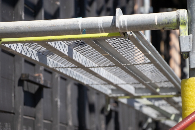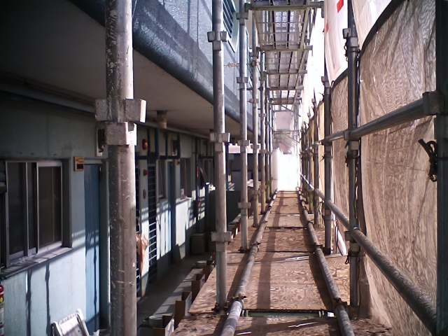 工事中は、足場の設置・解体時(各1日)に金属音が響きます。また、作業時間内(一般的に8:00〜17:00頃)は職人が足場の上を移動するため、窓のすぐ外に人の気配を感じることになります。