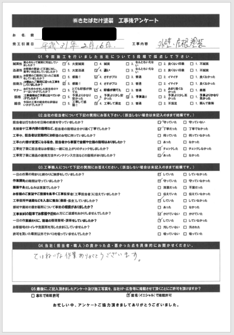 | 使用塗料 | 外壁/日本ペイント/ファインシリコンフレッシュ 屋根/日本ペイント/ファインパーフェクトベスト |