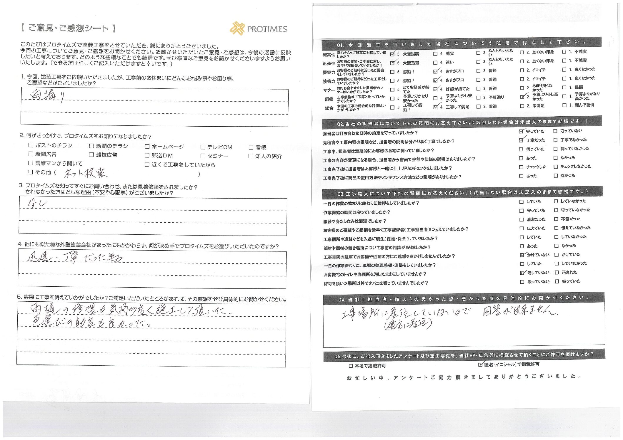 他にも似たような外壁塗装会社があったにもかかわらず、何が決め手でプロタイムズ市川行徳店をお選びいただいたのですか?