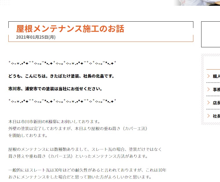 ホーム スタッフブログ デフォルト ページ 3 デフォルト 2023.11.23 デフォルト 究極(*^_^*) 2023.10.26 デフォルト ポスティングへGO! 2023.10.23 デフォルト 浦安花火大会🎆 2023.03.21 デフォルト 春の訪れ🌸 2021.11.19 デフォルト 税務調査。。。のお話。 2021.04.03 デフォルト たまには趣味のお話でも。。。 2021.03.28 デフォルト 縁切りのお話。 2021.02.20 デフォルト 塗装技能士という資格について。 2021.02.06 デフォルト 現場たより:イイヤマ 2021.01.31 デフォルト 屋根カバー工事のお話 投稿のページ送り < 1 2 3 ピックアップPICKUP 塗装品質へのこだわり 有資格者による建物診断 わかりやすく納得の見積もり ショールーム予約 ドローン診断 品質施工の裏付け お家の雨漏りでお困りの方へ 人気塗装ラインナップ リフォームローンのご紹介